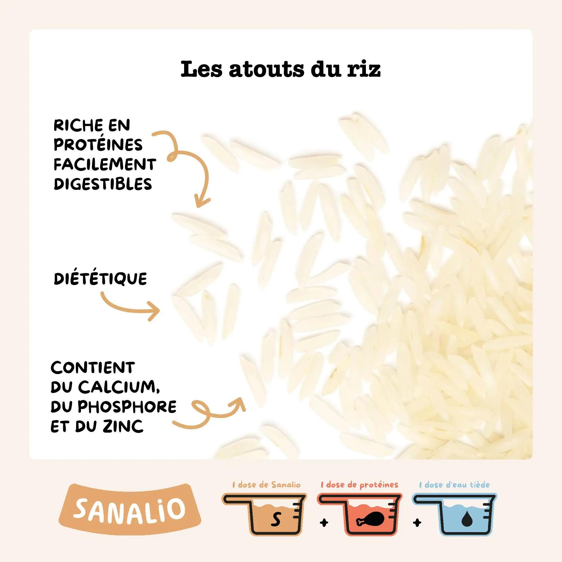 En l’associant à une source de protéines animales de qualité, la recette SANALIO apporte tous les nutriments essentiels à votre chien, grâce à un équilibre précis en fibres, glucides, lipides et micronutriments.