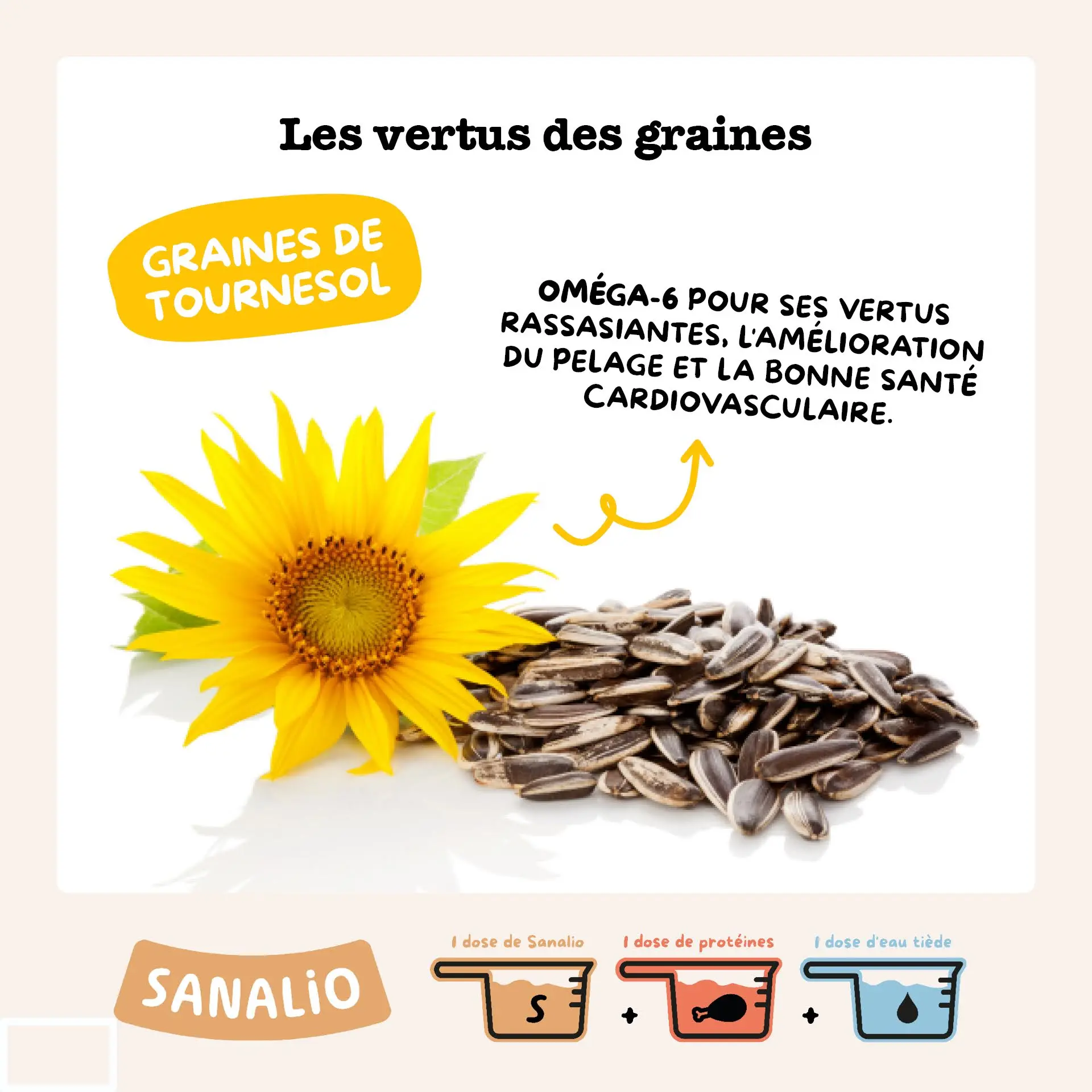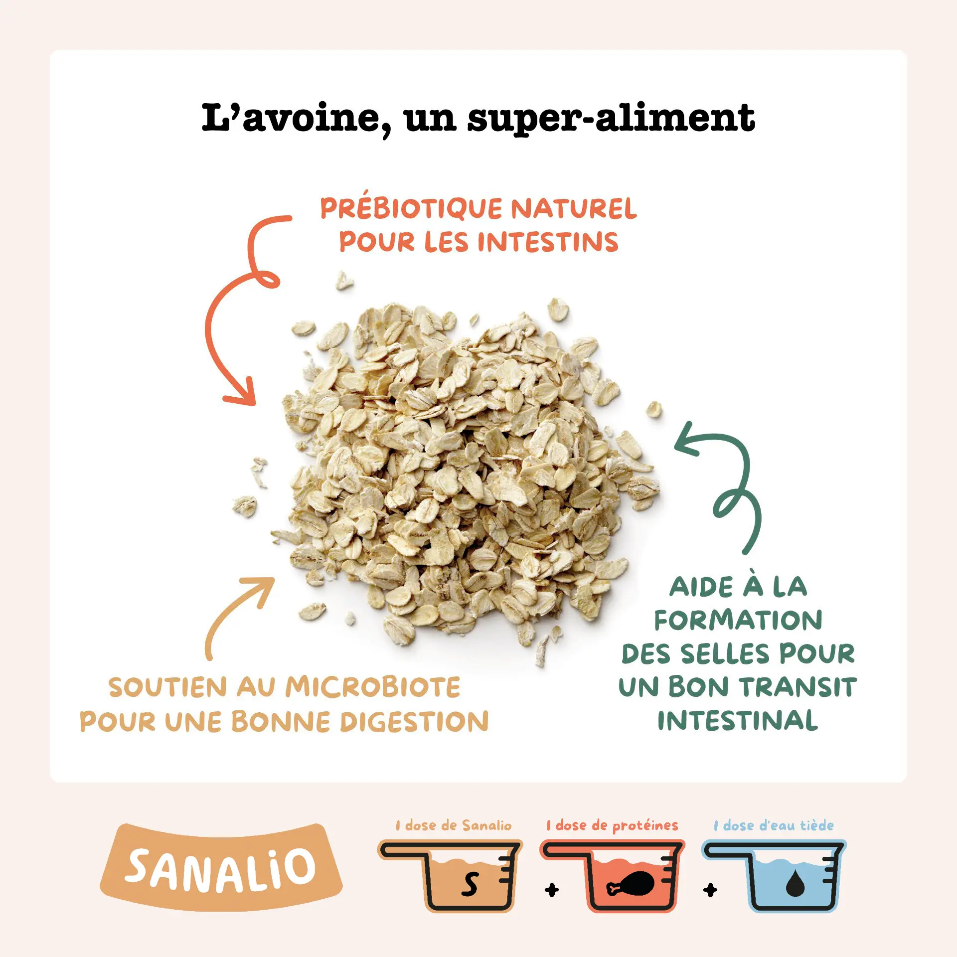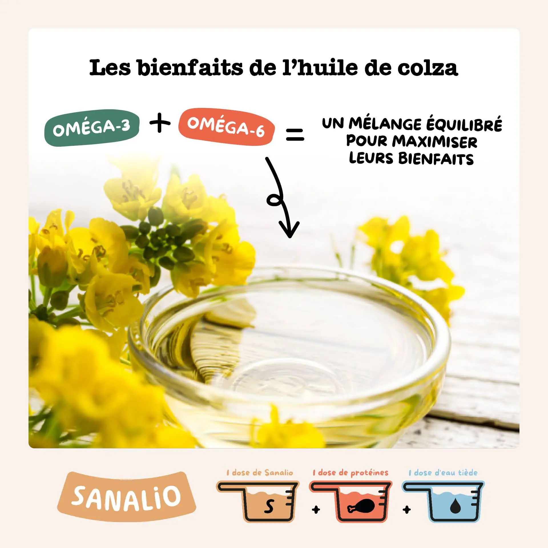 C’est pourquoi Sanalio vous laisse la liberté d’ajouter la source de protéine animale qui convient le mieux à votre compagnon, sans devoir toucher au dosage recommandé.
